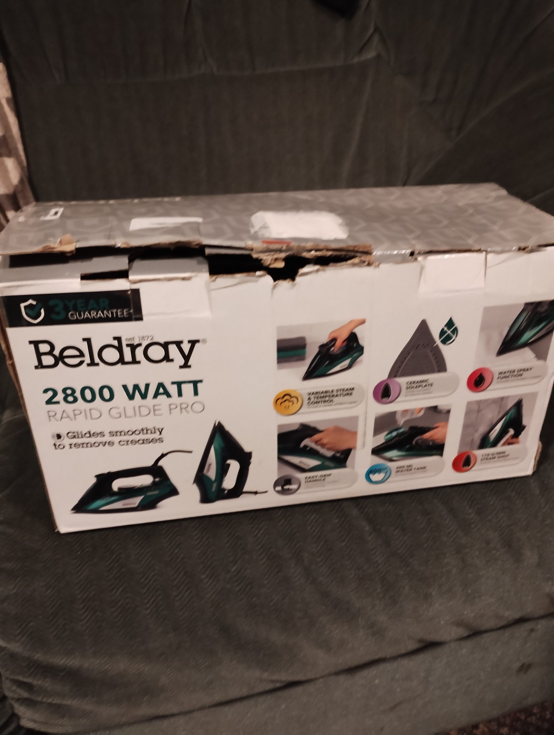 Beldray 2800 watt Rapid Glide Pro Iron in green with ceramic soleplate – unused and boxed. Passed PAT test.